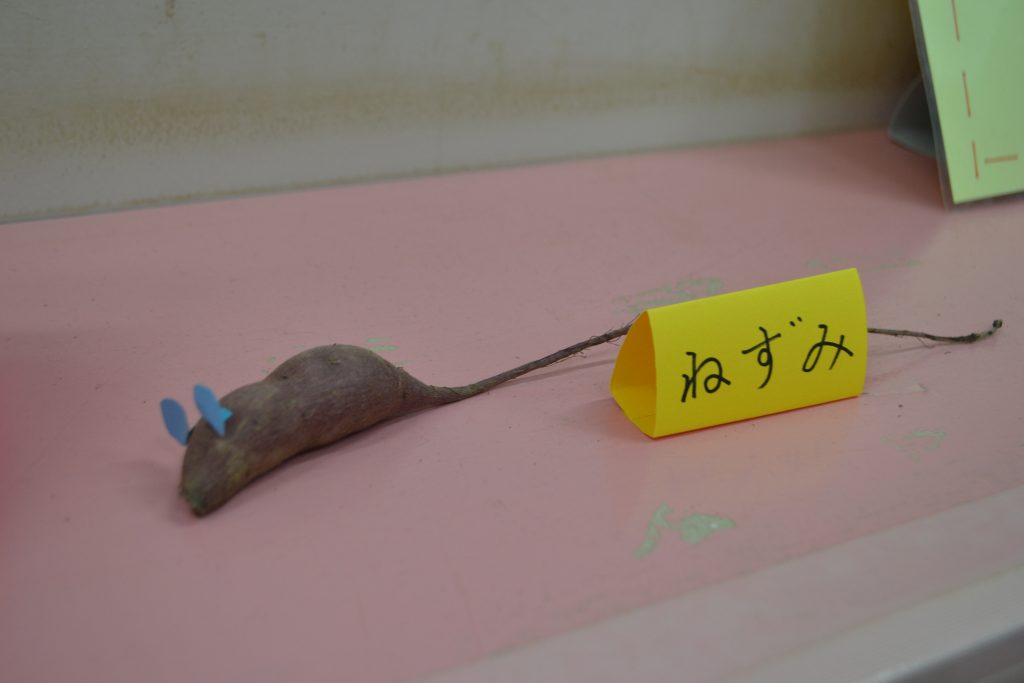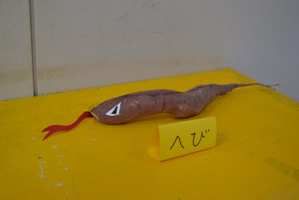 子どもたちに何の形に見えるか聞いてみると、「ネズミ!」「へび!」などいろいろな答えが返ってきて、『お芋美術館』ができました。